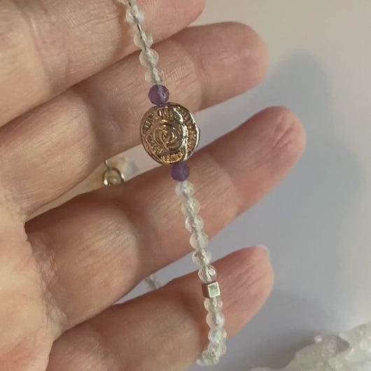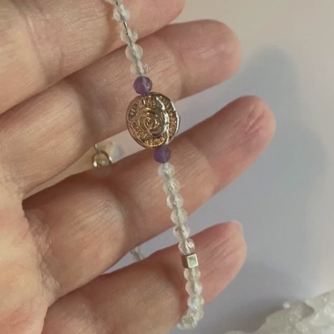This 18cm (7inch) bracelet features beautiful white iridescent 3mm round faceted rainbow moonstone crystal beads and cubic silver hematite beads. The faceted beads beautifully catch the light with each movement. Each bracelet features an adjuster chain, this one is finished with a single rainbow moonstone bead to fit comfortably and match the overall style.